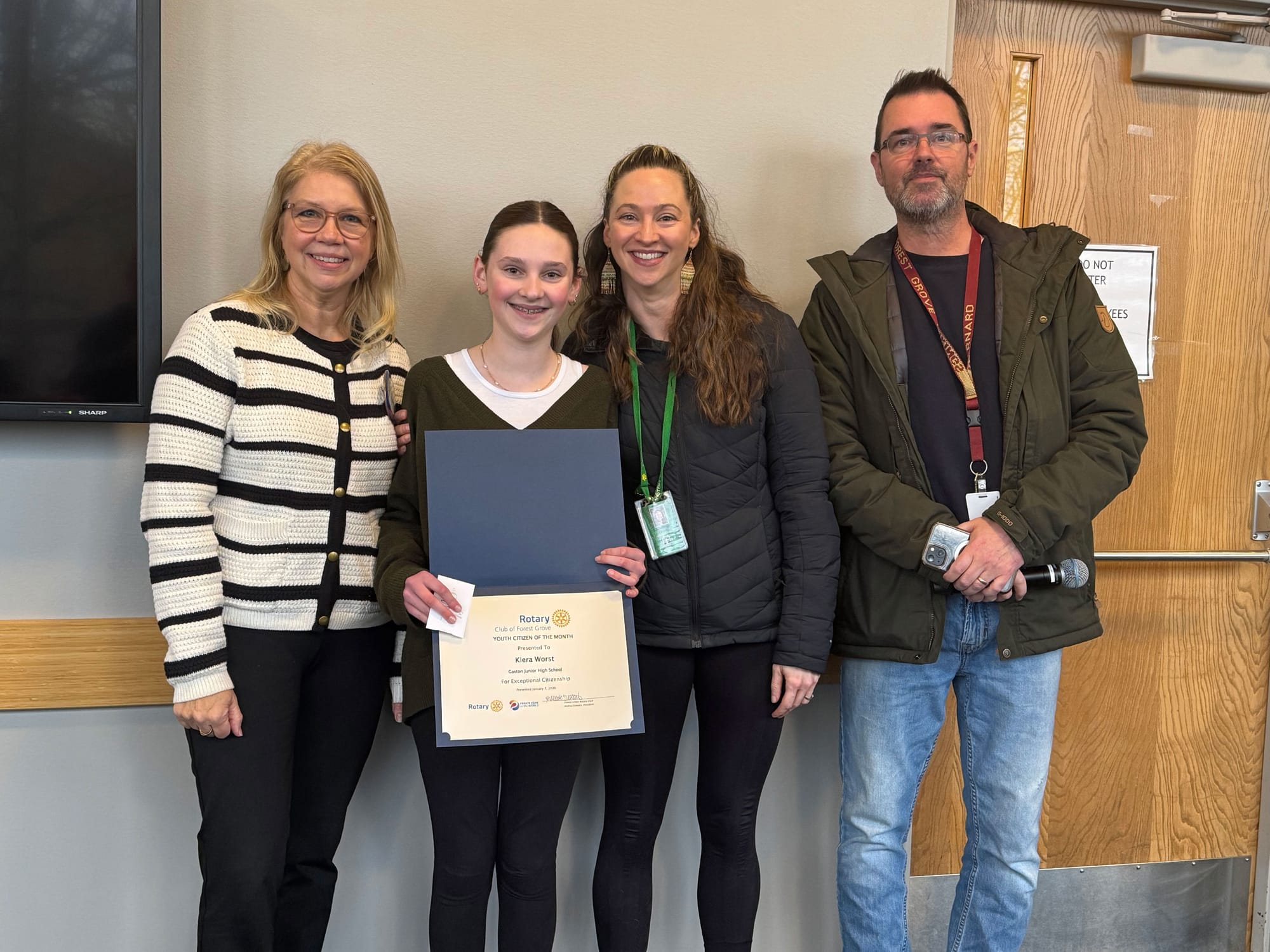 Left: Rotary Club of Forest Grove President Andrea Stewart, Lucas Getzendaner, parents and grandmother. Right: Rotary Club of Forest Grove President Andrea Stewart, Keira Worst & her mother and Rotary Youth Citizen of the Month coordinator Steven Barnard. Photos courtesy Rotary Club of Forest Grove