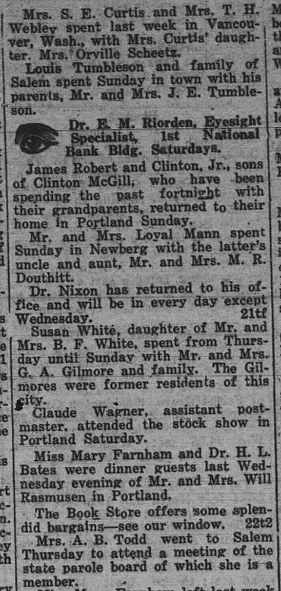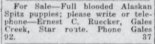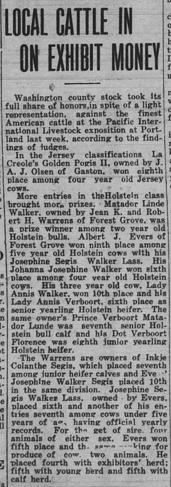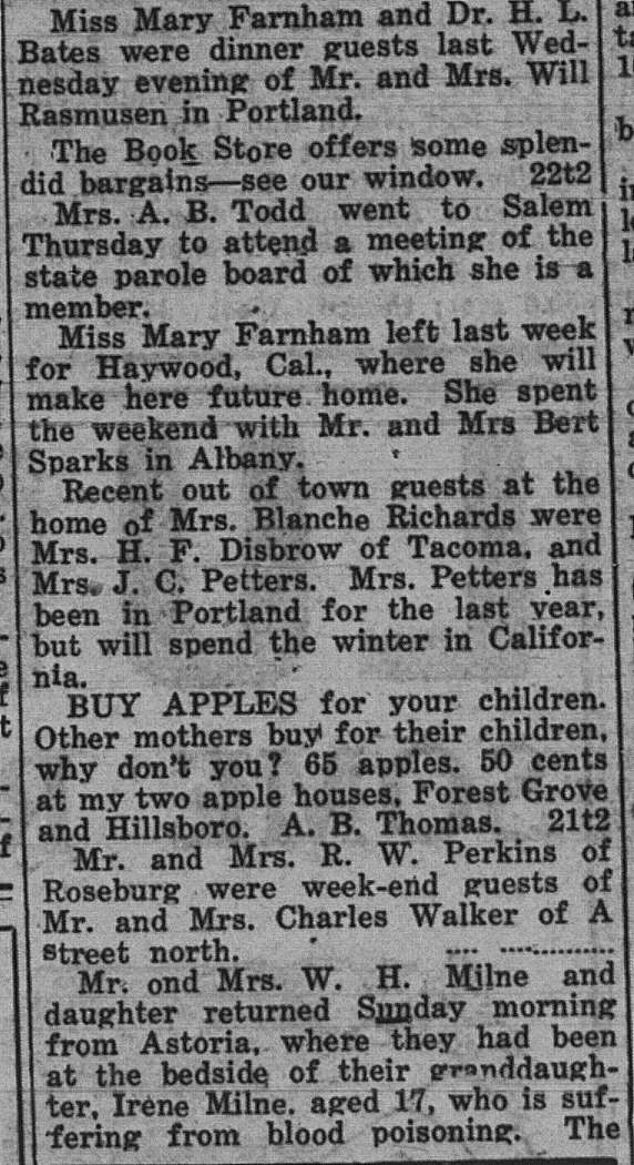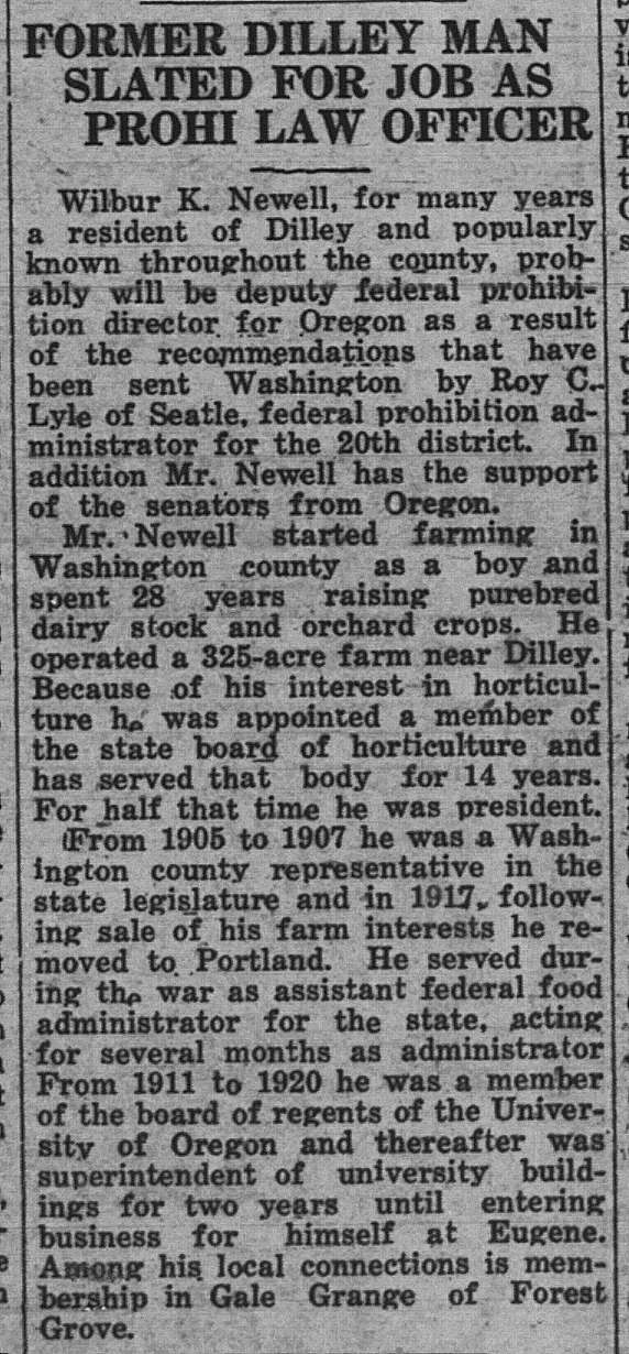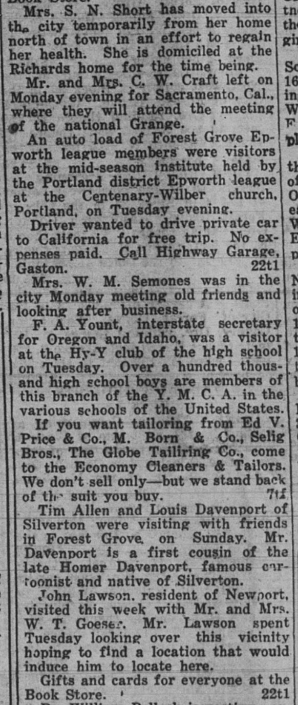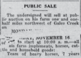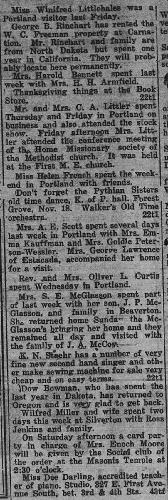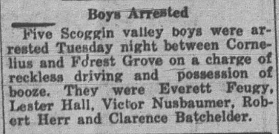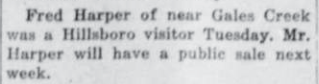 These news clips are selected for news events in and around Forest Grove and Banks that I believe would have been of significance to readers of the time, or of interest to readers of today. They are presented as-is, and without comment. At the time, the newspapers of the day often expressed viewpoints that today would be considered racist, xenophobic, and sexist, frequently using slurs to describe ethnic groups and often stepping outside the norms of what we consider to be ethical journalism today.