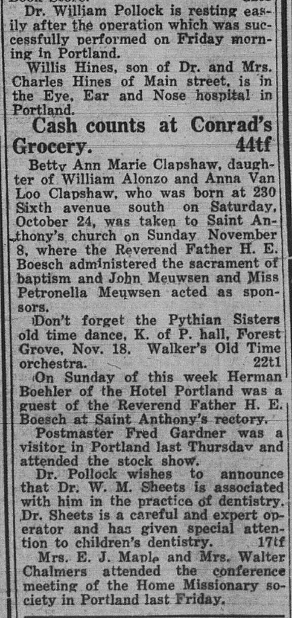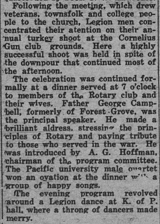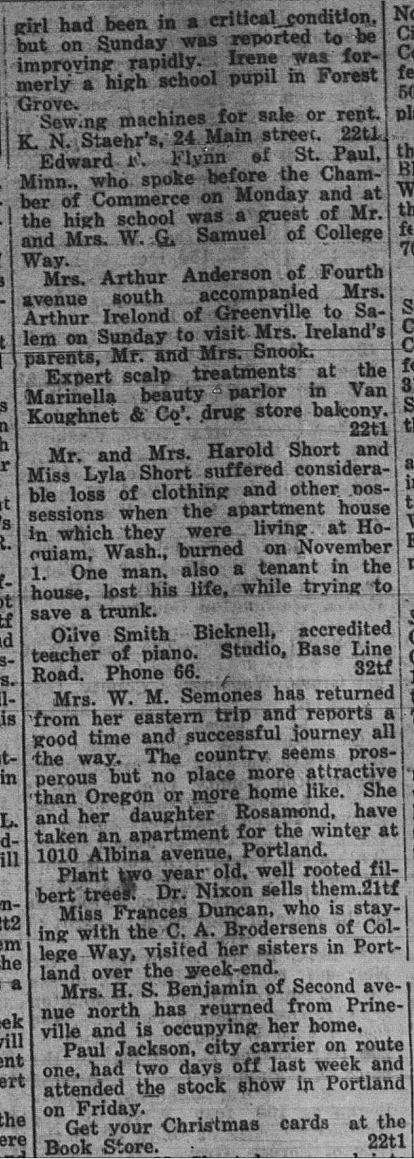 In this column, we take a look back one hundred years ago in Forest Grove, Banks, Gales Creek, and other rural communities in western Washington County. This week, the clips come from the Hillsboro Argus, published November 12, 1925 and the Washington County News-Times published Nov. 12. Tap on an image to bring it into focus.