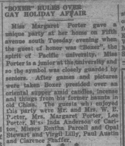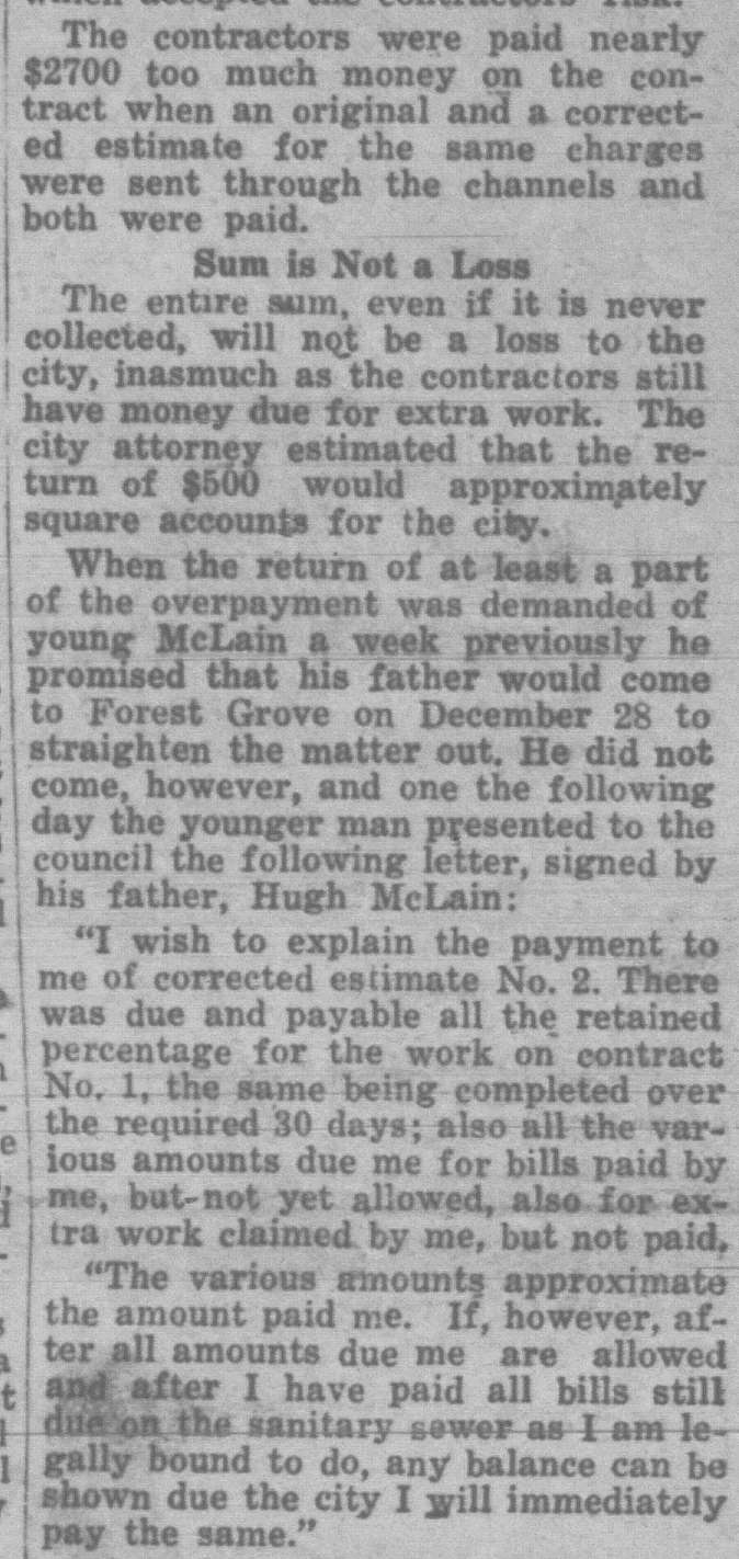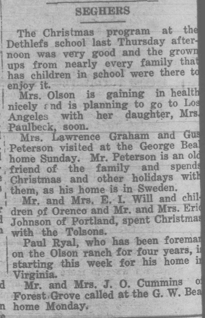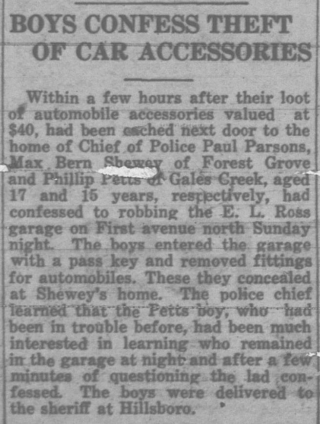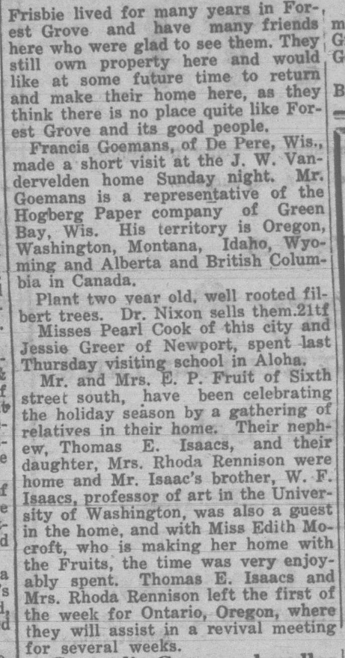 These news clips are selected for news events in and around Forest Grove and Banks that I believe would have been of significance to readers of the time, or of interest to readers of today. They are presented as-is, and without comment. At the time, the newspapers of the day often expressed viewpoints that today would be considered racist, xenophobic, and sexist, frequently using slurs to describe ethnic groups and often stepping outside the norms of what we consider to be ethical journalism today.