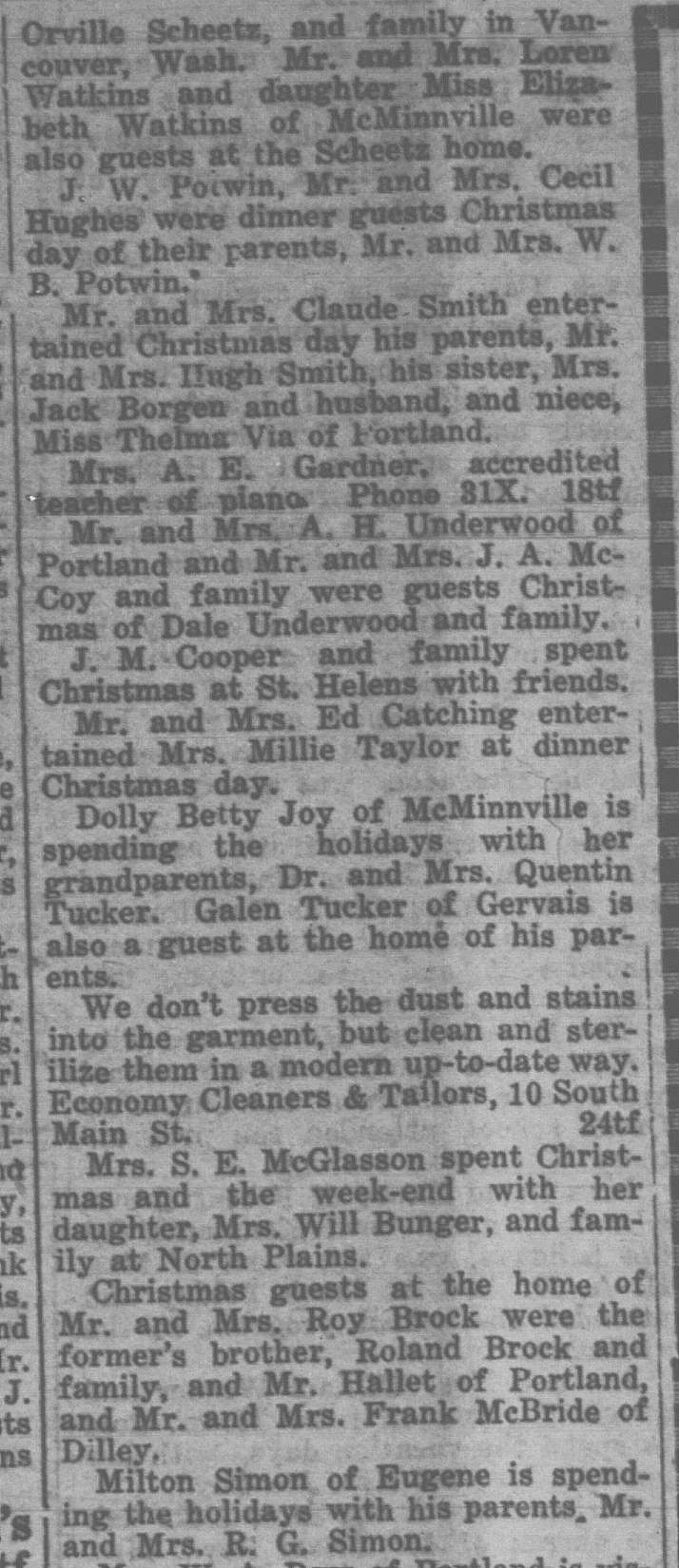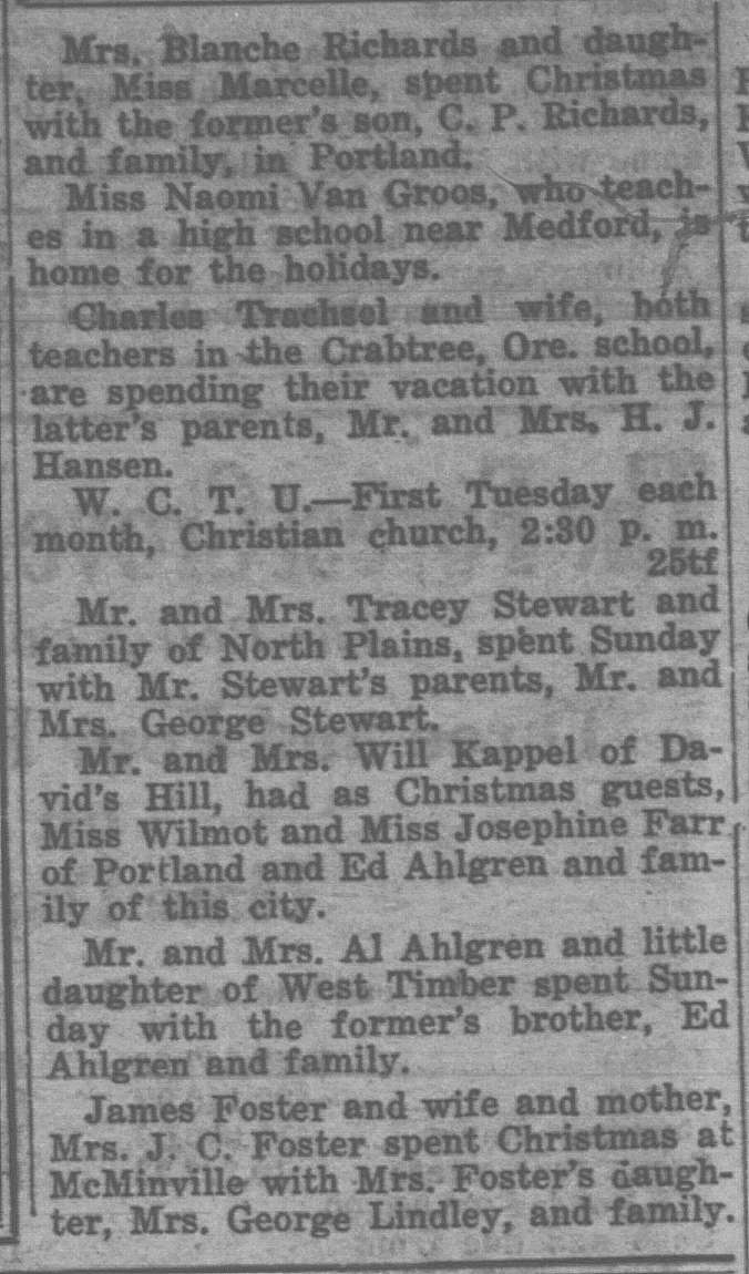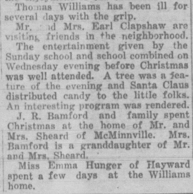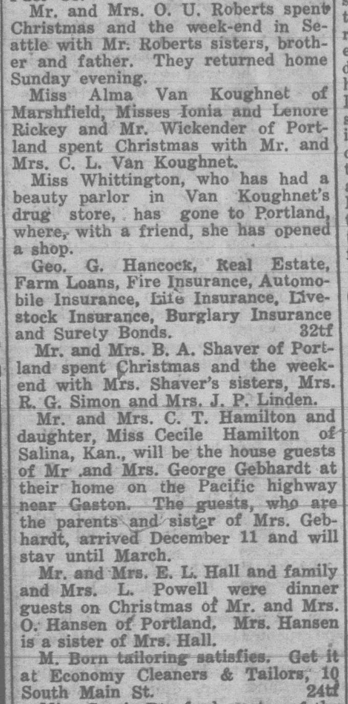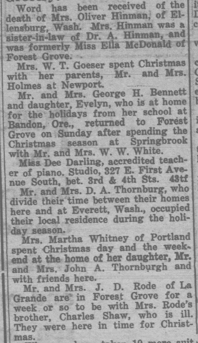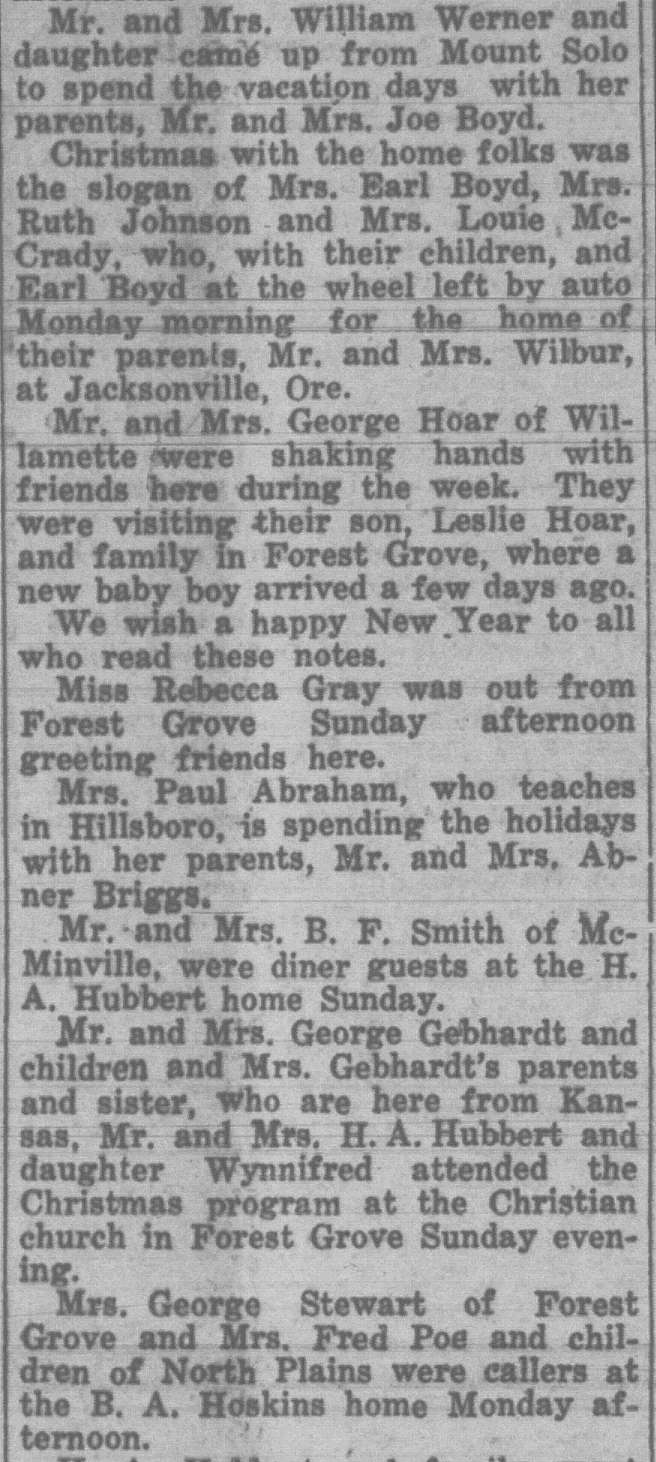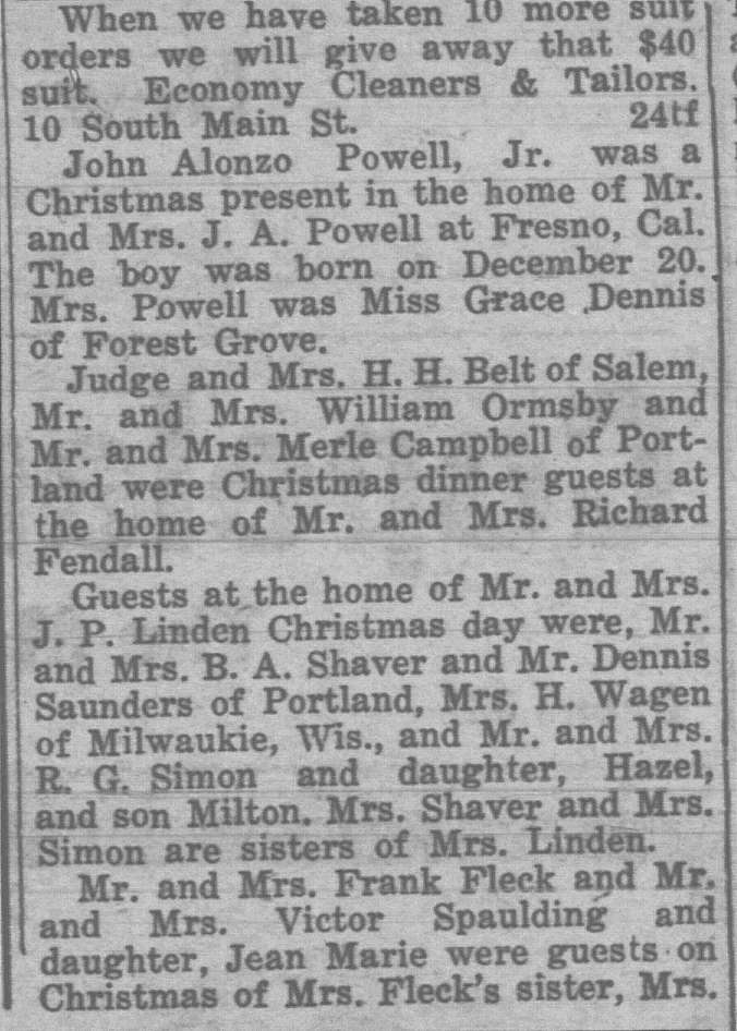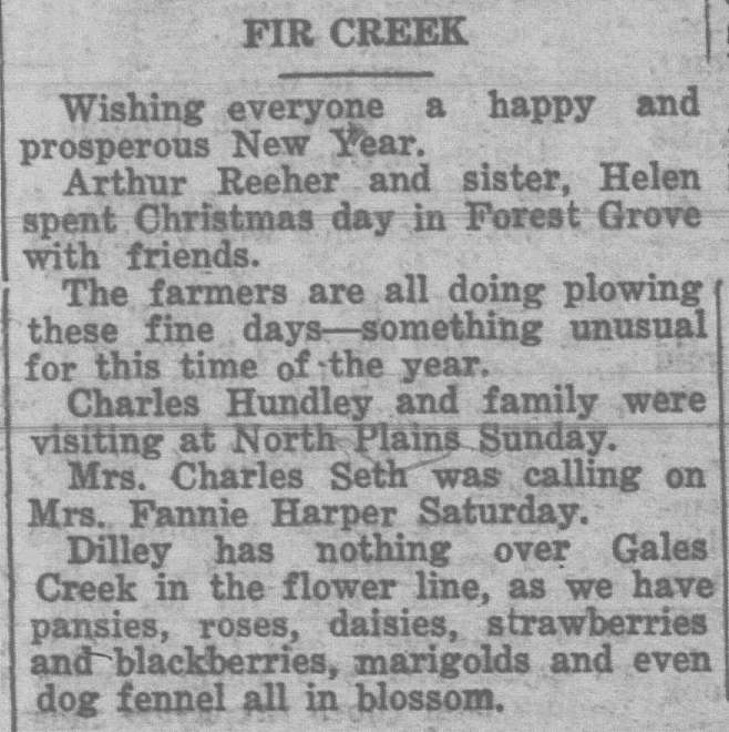 In this column, we take a look back one hundred years ago in Forest Grove, Banks, Gales Creek, and other rural communities in western Washington County. This week, the clips come from the Washington County News-Times and the Hillsboro Argus, eachpublished December 31, 1926.