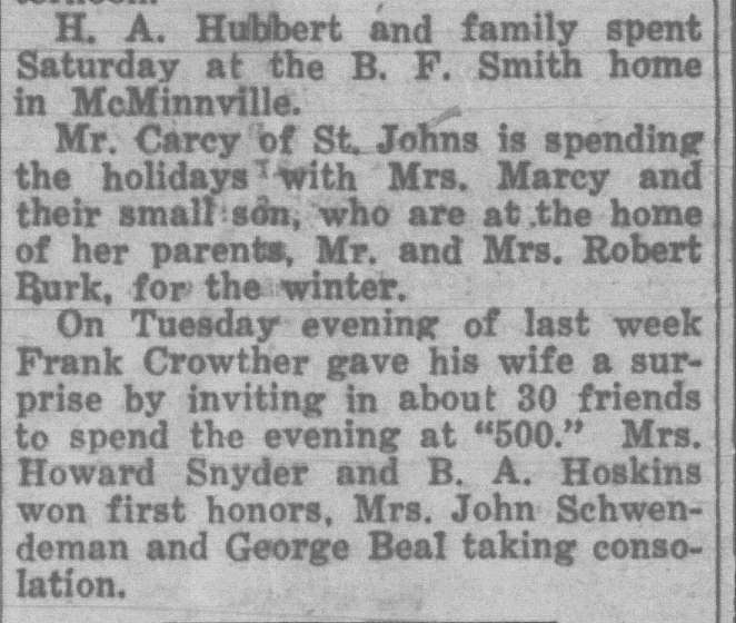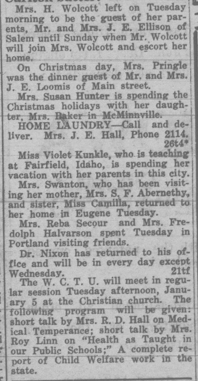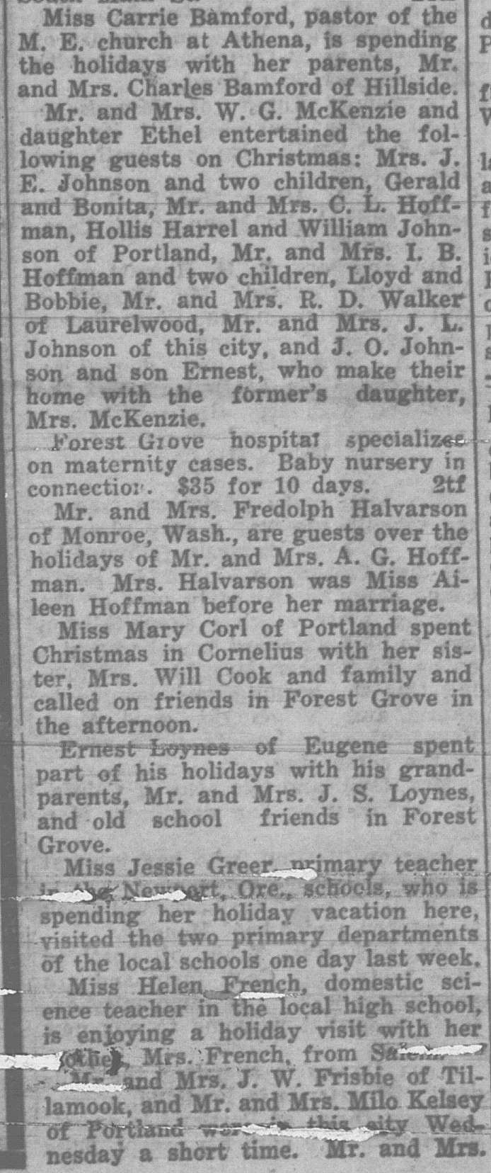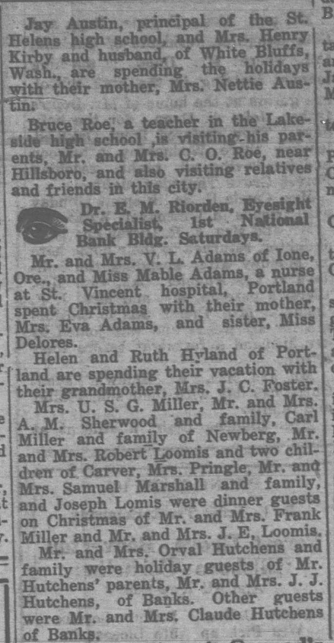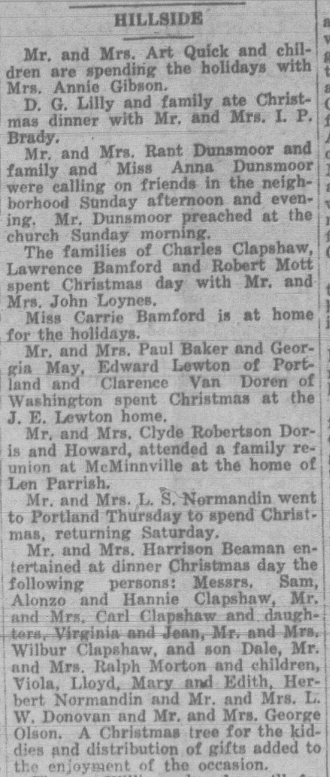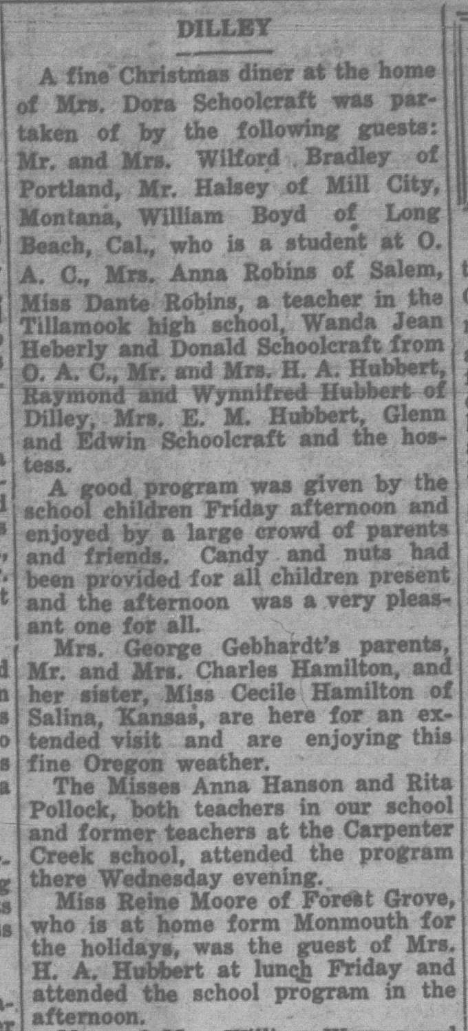 In this column, we take a look back one hundred years ago in Forest Grove, Banks, Gales Creek, and other rural communities in western Washington County. This week, the clips come from the Washington County News-Times and the Hillsboro Argus, eachpublished December 31, 1926.