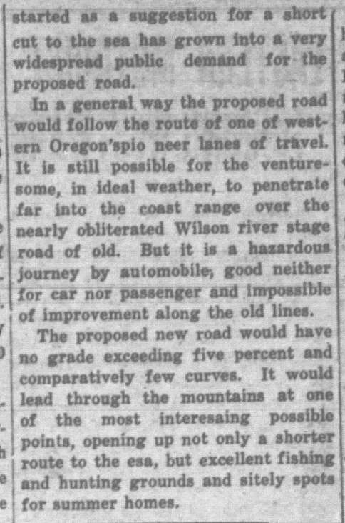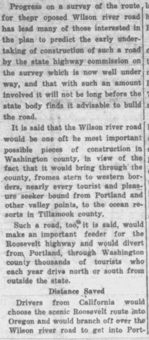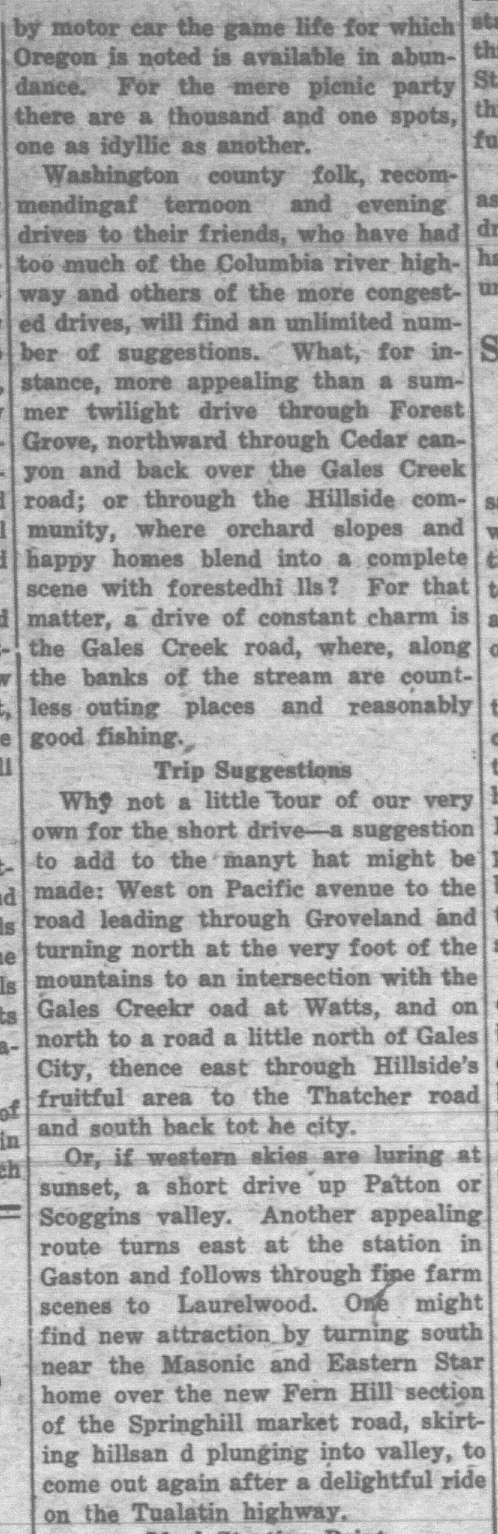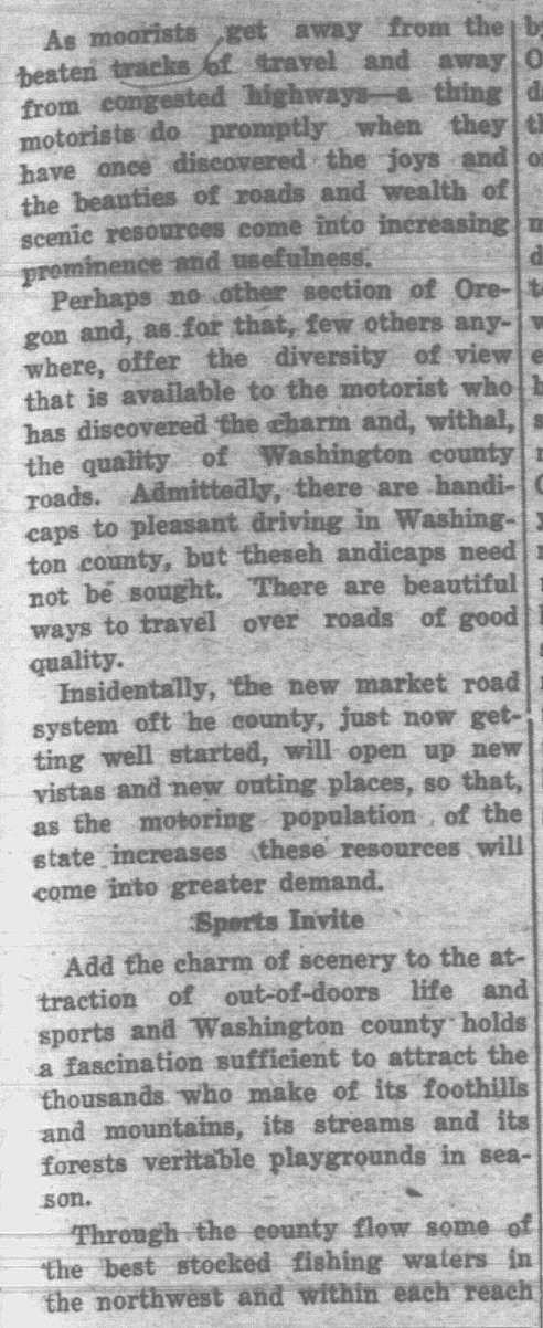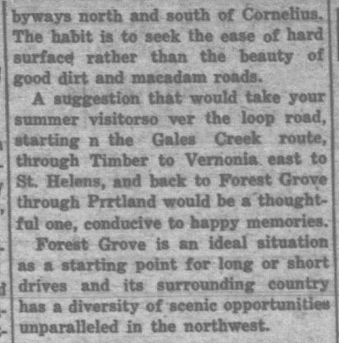 1926: A dream of a highway connecting Forest Grove to Tillamook continued. Dilley and Gales Creek feuded over flowers. Bacona, north of Buxton, still had a post office. Step into Forest Grove and Banks-area history from the lens of newspaper archives of the day.