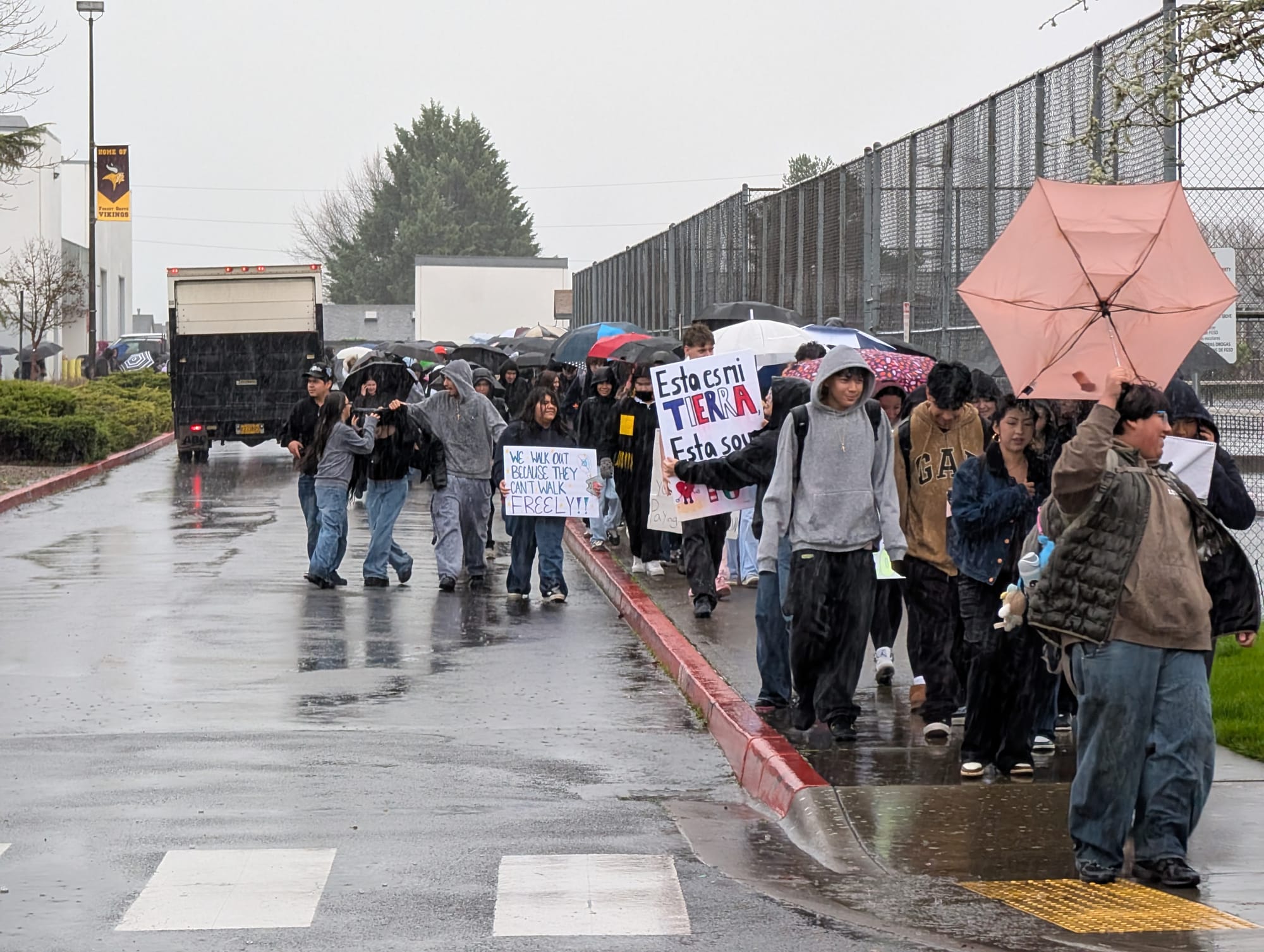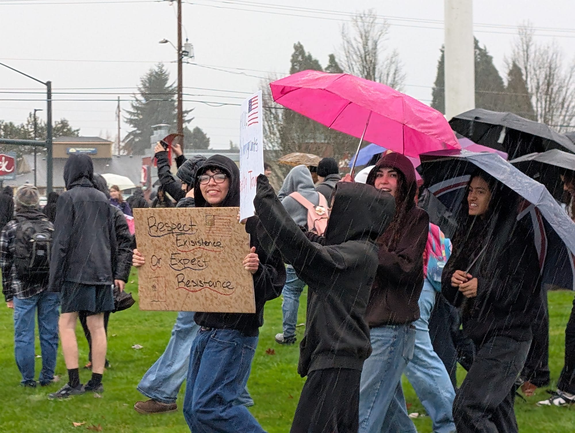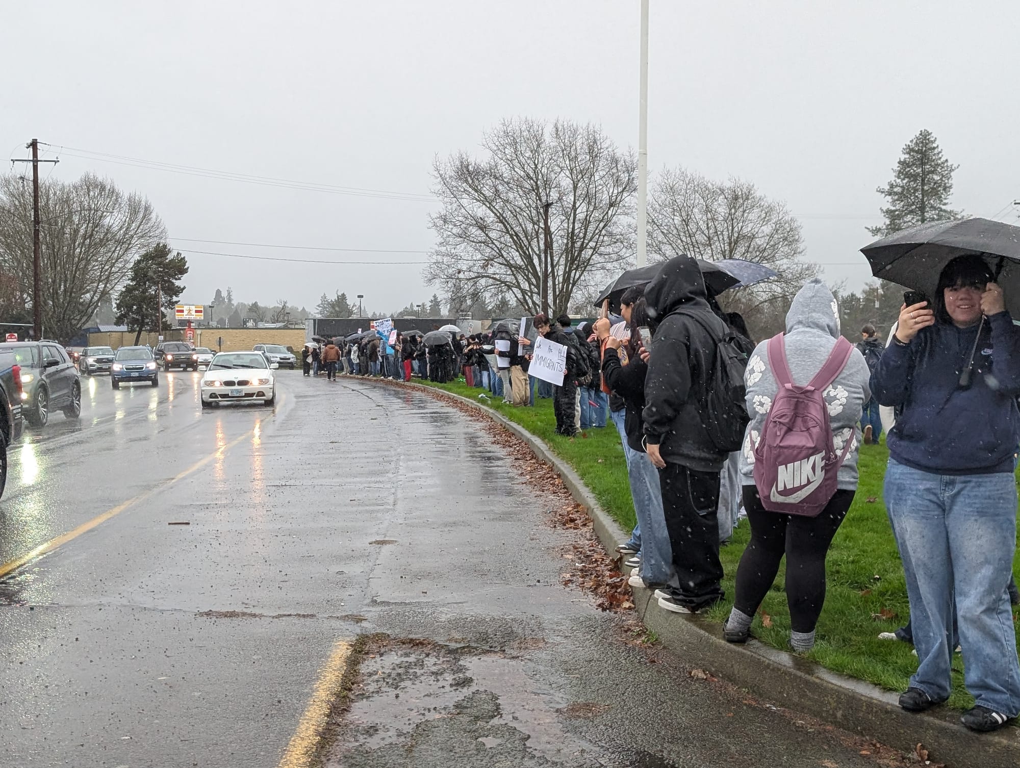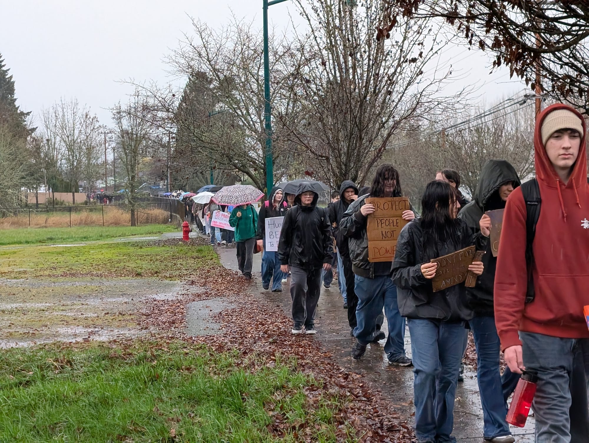 Students began their walkout at 10 a.m., Monday, Dec. 8, as rain significant enough to trigger a flood watch in Forest Grove and other areas fell.
